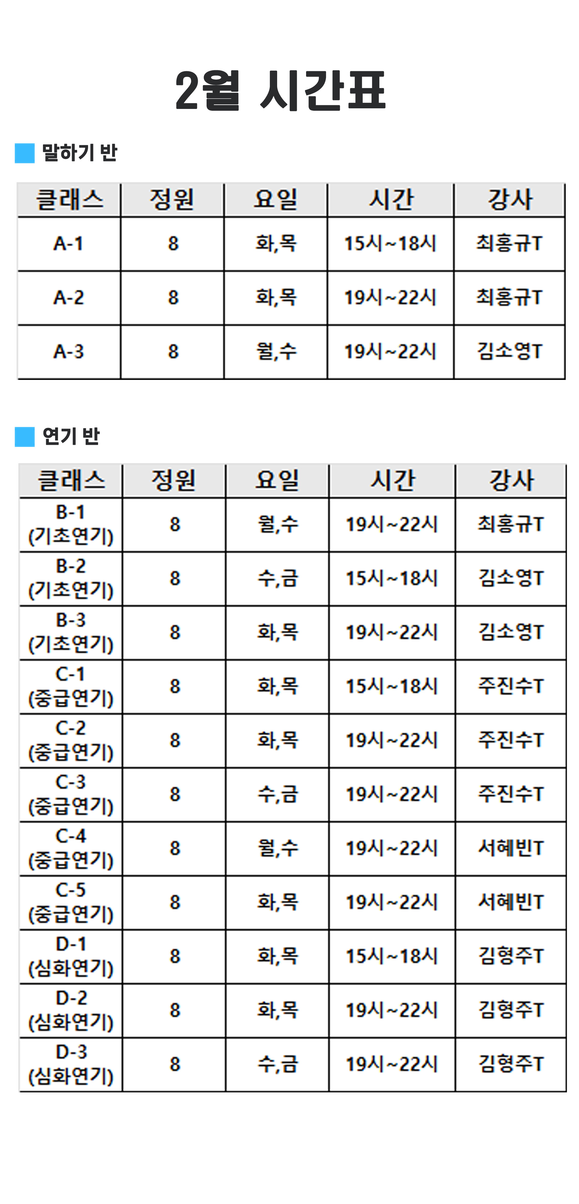 | B-2 (기초연기) | 8 | 수,금 | 15시 ~ 18시 | 김소영T |